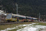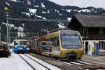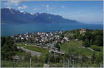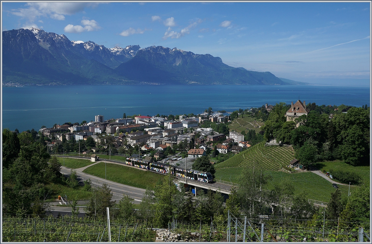 Der von Sarah Morris als "Monarch" gestaltete Lenkerpendel ABt 341 - Be 4/4 5001 - Bt 241 ist auf dem Weg von Montreux nach Zweisimmen und überquert bei Châtelard die Autobahn A9.
