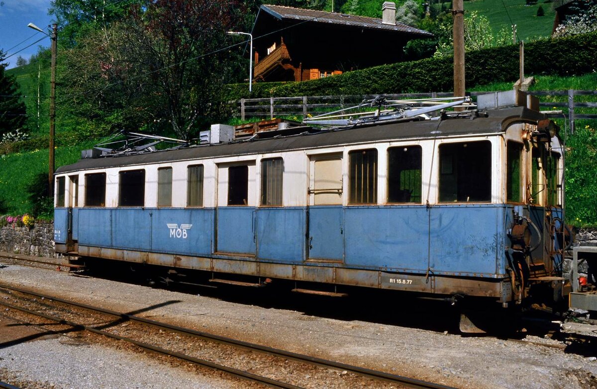 Am Bahnhof Les Avants begegneten sich ein neuerer Lokalzug (Schweizer Baureihe Be 4/4) der Linie Montreux-Les Avants-Montreux und der schon abgestellte Motorwagen BDe 4/4 26 der Montreux Berner Oberland Bahn (18.05.1986) Frank Nowotny