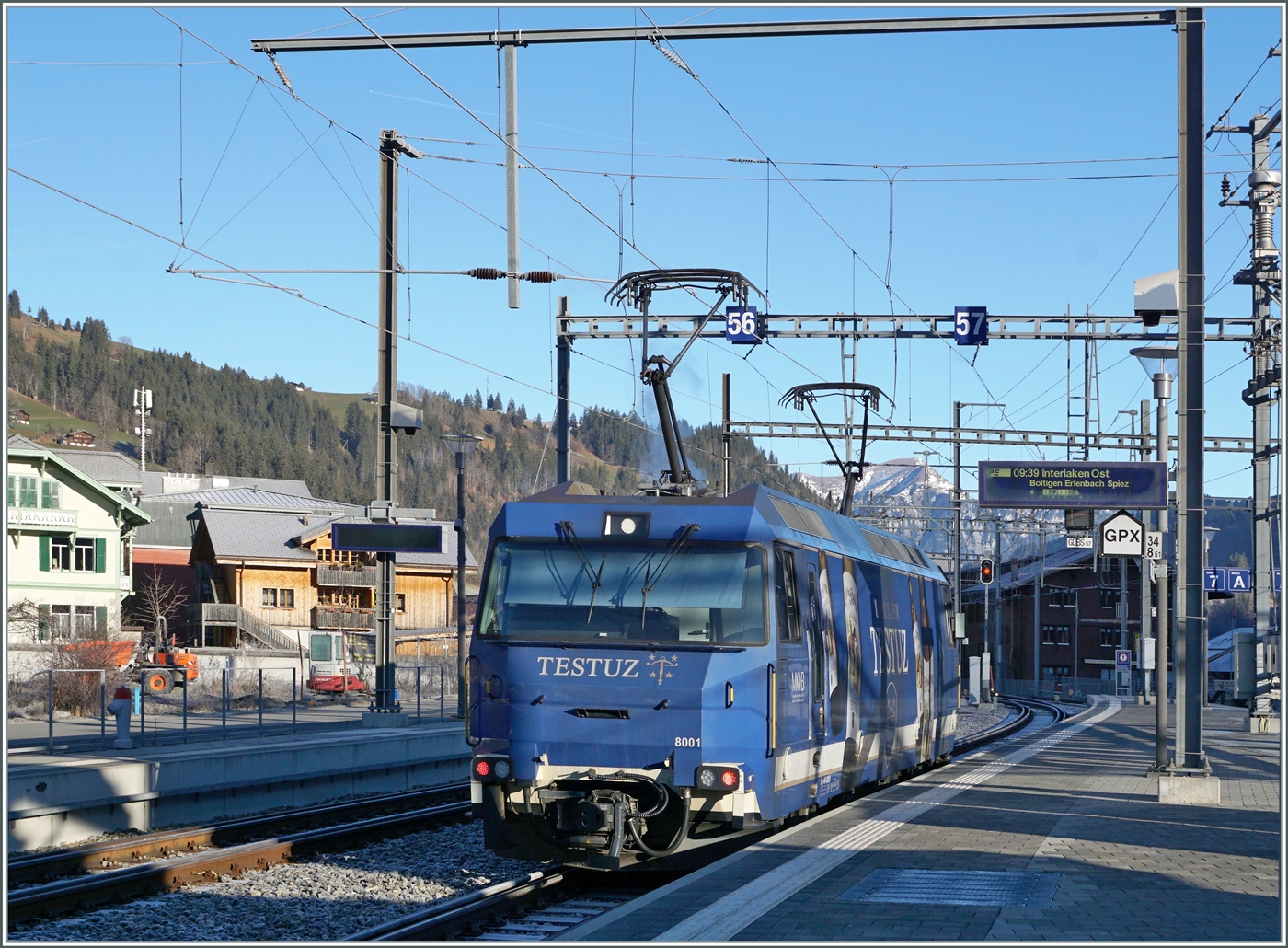 Die MOB Ge 4/4 8001 ist mit ihrem Golden Pass Express GPX PE 4064 von Montreux kommend in Zweisimmen angekommen. Der Zug wurde bei der Einfahrt bereits umgespurt und wird nun von der BLS Re 465 011 für die Weiterfahrt nach Interlaken Ost übernommen.