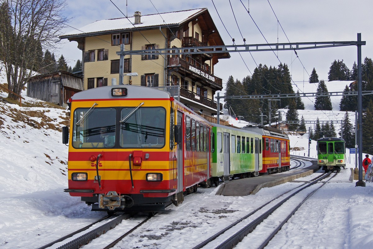 Hallo Walter, ein schönes Bild der BVB vom "Col de Soud". Ich finde es gut, wie haushälterisch die Bahnen mit ihrem Mitteln umgehen, schliesslich ist es "unser Geld" und, weit wichtiger, Eisenbahnbahnfahrzeuge sind so gebaut, dass sie ohne weiters 50 Jahre genutzt werden können, was ja auch ein Beitrag zum Umweltschutz ist.