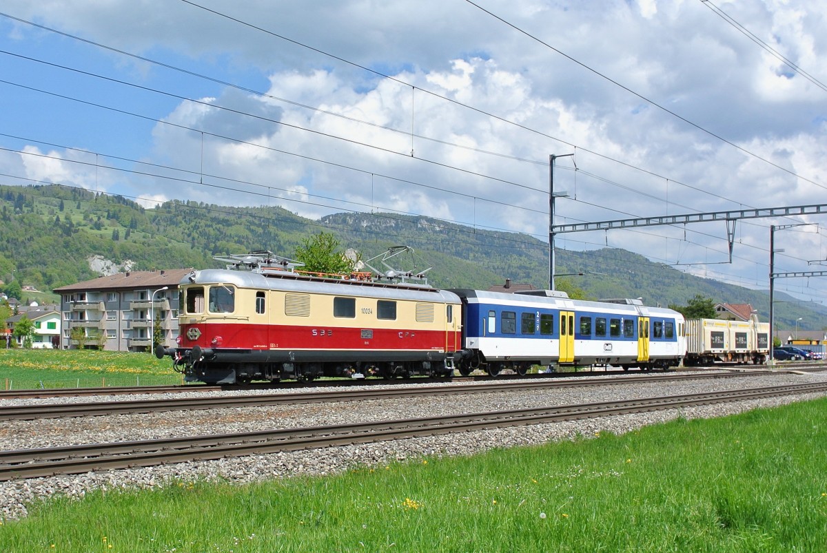 Nach der erfolgten REV2 wurde der OeBB Bt NPZ 50 85 80-34 000-9 heute von der Re 4/4 I 10034 von Olten (IW Standort) via Oensingen nach Balsthal überführt. Im Bild mach dieses einmalige Gespann einen Diensthalt in Oberbuchsiten, 23.04.2014.