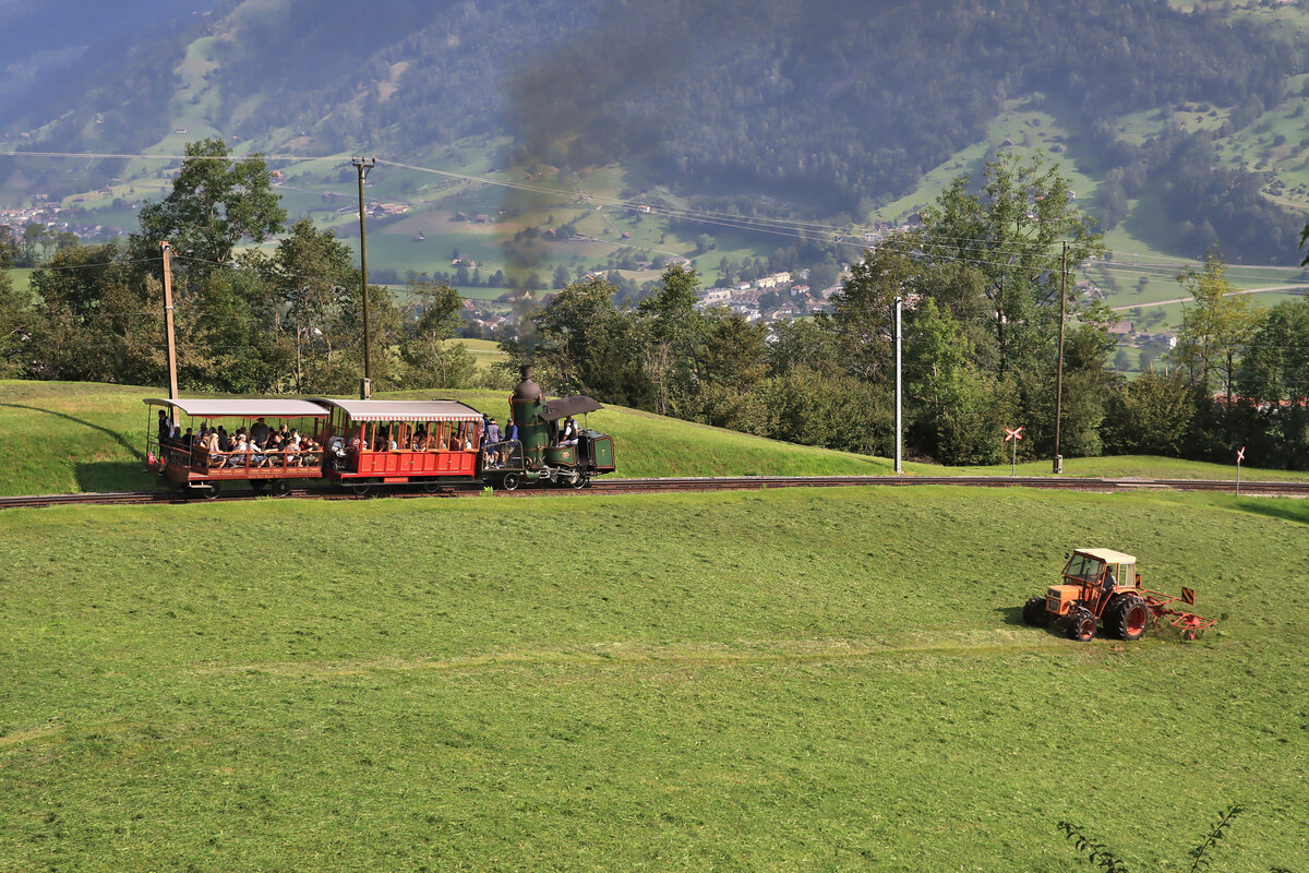 Die Rigi Bahn Dampflok 7 beim Aufstieg nach Rigi Kulm. Die beiden Wagen sind der rote VRB (Vitznau Rigi Bahn) Nr. 5 und der offene ARB (Arth Rigi Bahn) Nr.11. 24.Juli 2021
