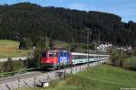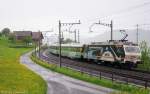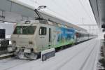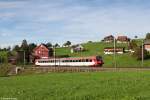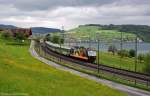 SOB: VORALPEN-EXPRESS mit Re 446 017-6 am Zugsschluss bei Steinerberg am 26. Februar 2015.