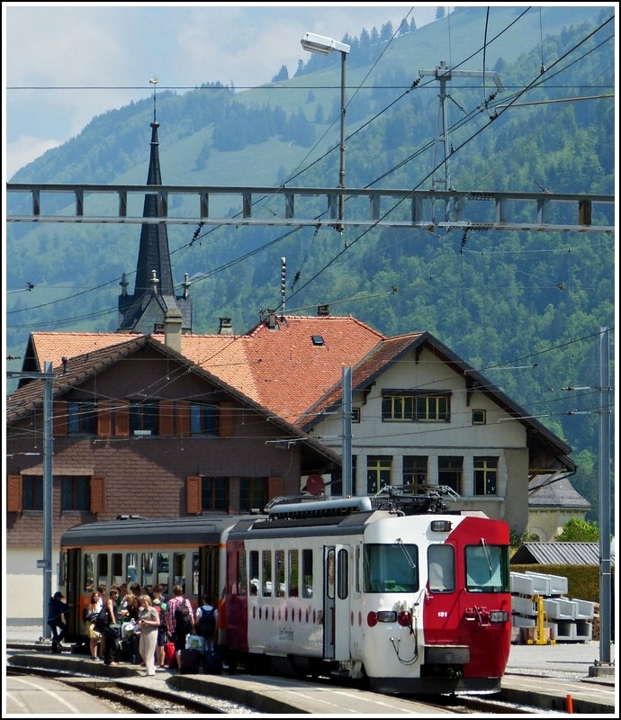 - Großer Andrang - In Montbovon wird am 25.05.2012 der TPF Be 4/4 151 regelrecht von den Fahrgästen gestürmt. (Jeanny)