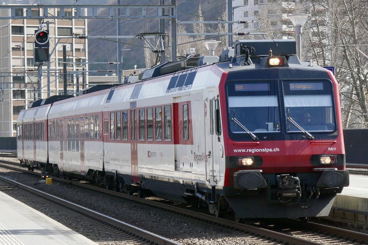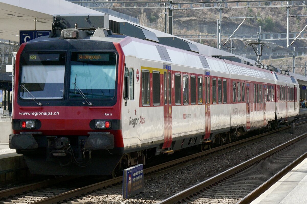 Der Region Alps RBBe 560 007 verlässt mit Mittel- und Steuerwagen Martigny in Richtung Brig.