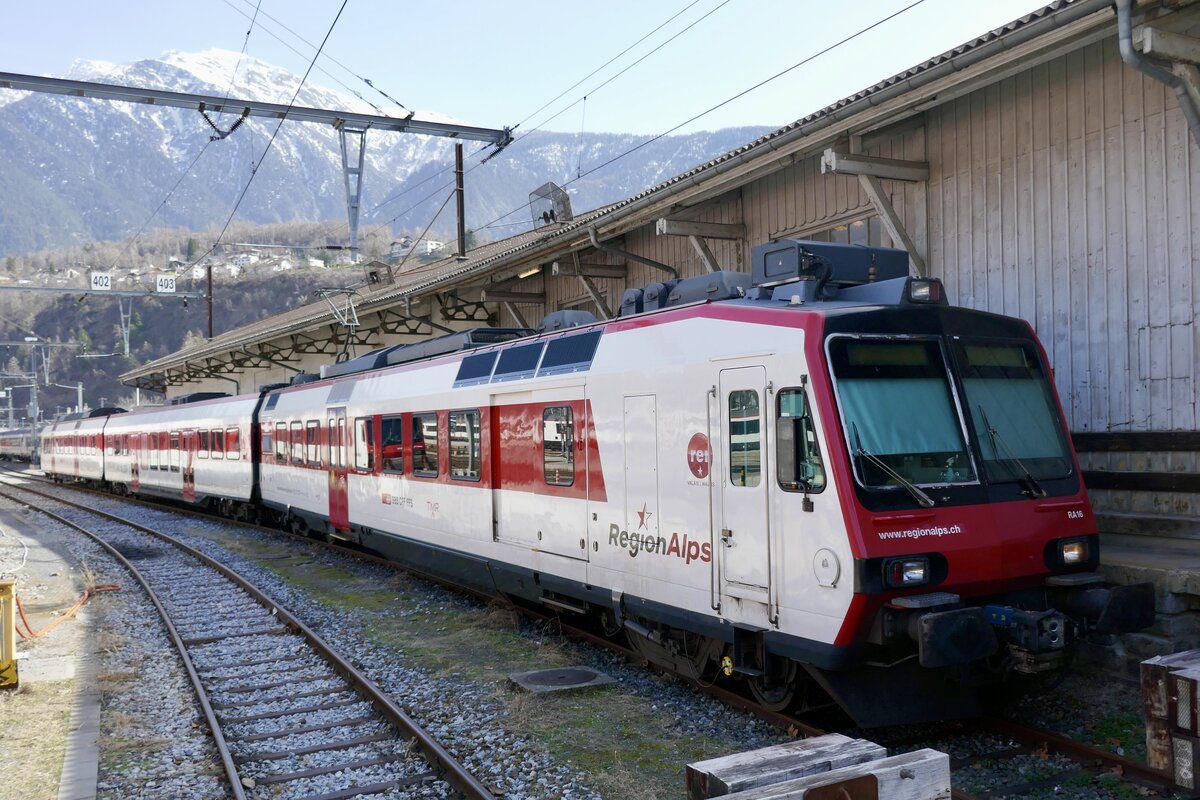 In Martigny wendet der TMR Region Alpes RABe 525 039 für die Rückfahrt nach Le Châble und ein TMR Region Alpes Domino verlässt den Bahnhof in Richtung Brig.
