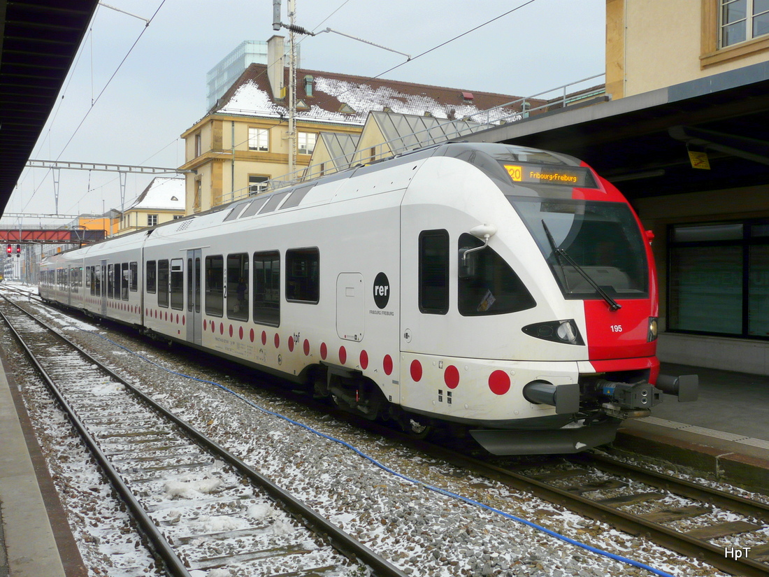 tpf - Triebzug RABe 527 195-7 als S20 nach Fribourg im Bahnhof Neuchâtel am 07.02.2015