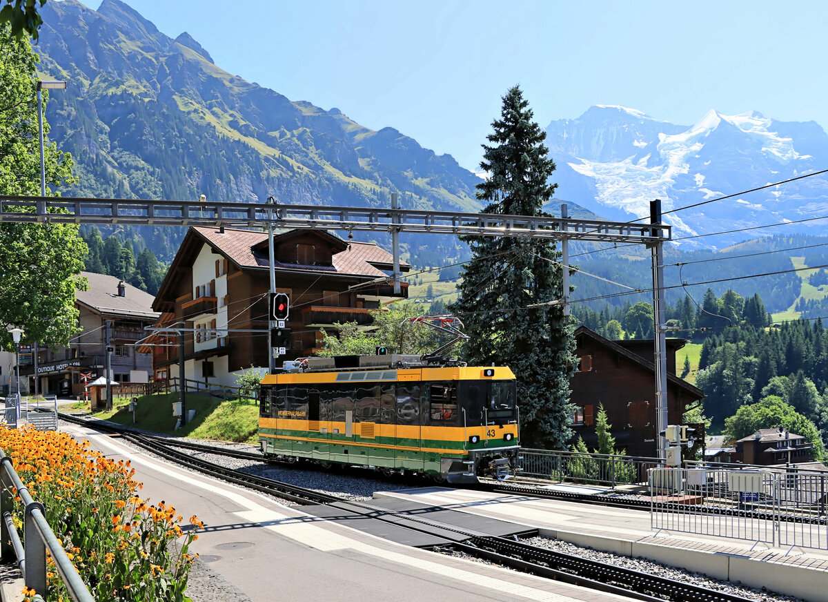 Der neue He(m) 4/4 43 der Wengernalpbahn bei der Durchfahrt durch den Bahnhof Wengen. 16.August 2022
