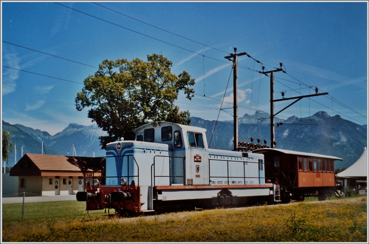 Von 1988 bis 1998 fuhren im Tourismus- bzw. Museumsbahn-Verkehr Reisezüge unter dem Namen "Rive Bleue Express" von Bouveret nach Evian und zurück. Dafür hatte die RBE Bahn eine E 3/3 (Tigerli) und die hier abgebildete BB 71010 (ex SNCF/Baujahr 1965) zur Verfügung. Obwohl seit fünf Jahren infolge schlechten Gleiszustandes keine Züge mehr nach Evian verkehrten, stand im Mai 2003 die BB 71010 mit einem O-C Wagen weiterhin in Bouveret, wohl in der Hoffung, dass eines Tages wieder nach Evian gefahren werden kann.