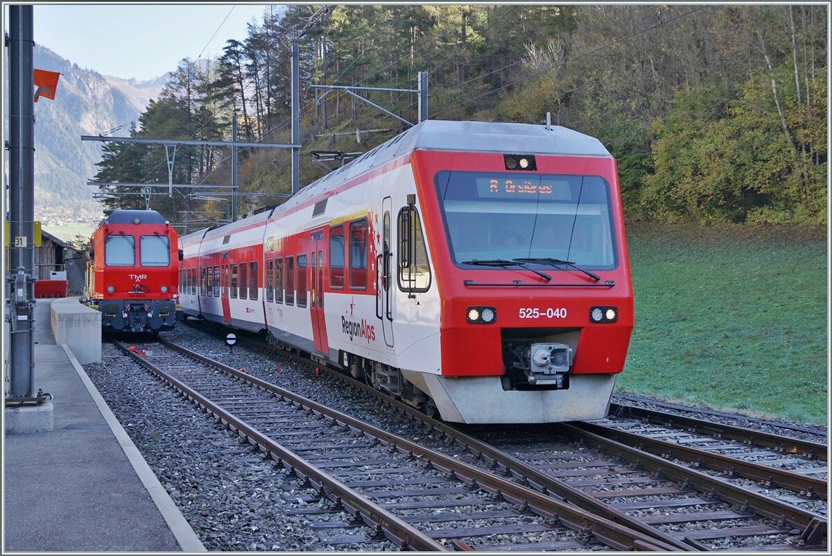 Während die beiden NINA RABe 525 039 und 040 als R 82 26121 nach Martigny unterwegs sind erreicht der TMR Region Alpes RABe 525 041 (und ein weiterer) als R 81 26120 Sembrancher. Nach kurzem Aufenthalt wird der Zug nach Le Châble weiterfahre.