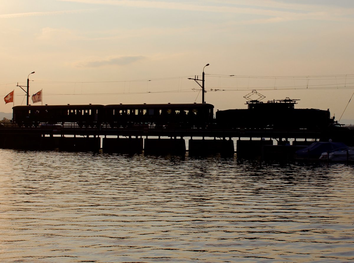 Das SBB Historic Krokodil Be 6/8 III Nr. 13302 war unterwegs am 23. September 2017 mit den beiden Waggons B 8112 (2. Klasse)und AB 4126 (1./2. Klasse) auf dem Seedamm bei Rapperswil. Nur wenige hundert Meter wird dann das Krokodil die Fahrt (von Rapperswil-Pfäffikon SZ-Sargans-Pfäffikon SZ-Rapperswil) hinter sich haben.