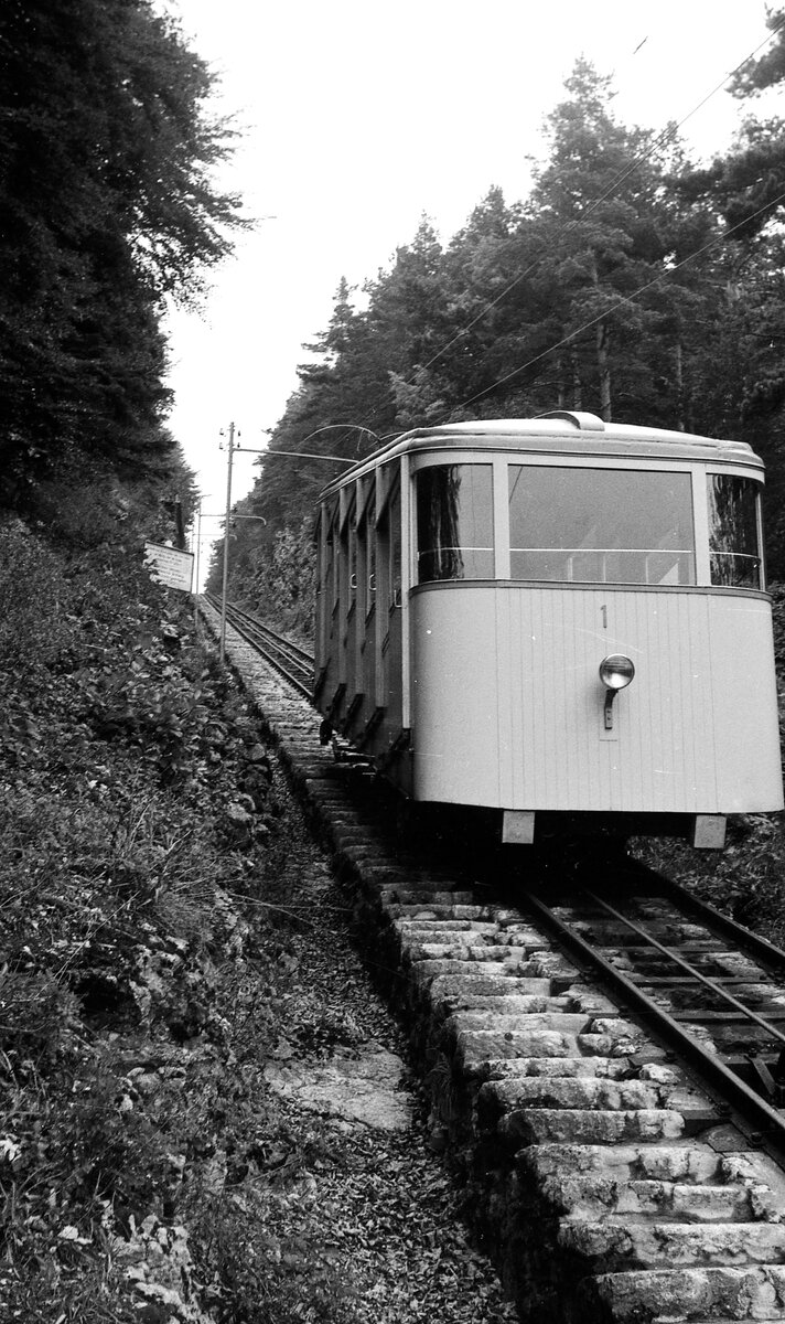 Lac d'Emosson - Staumauerbasis bis Staumauerkrone: Einschienen-Zahnradbahn mit Zweitakt-Benzinmotor, in Betrieb von 1977 bis 1989. Die Fahrgäste saßen hintereinander in den halbrunden Sitzschalen. Heute ist der “Monorail” mit Anhänger bei der Talstation Le Châtelard ausgestellt (Eigenes Dokument 27.06.1988)