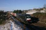 185 597-2 von Crossrail steht abfahrbereit am 20.01.2010 mit einem Bulkhaul Containerzug in Aachen West der kurze Zeit vorher von einer Cobra aus Belgien gebracht wurde.