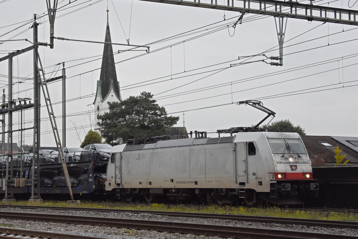 Belgiën DBC Loks 186234+186225 ziehen einem leerem Kalkzug nach Châtelet, in Warsage. Allein die zweite Lok hat eine Stromabnehmer hoch. 23/1/2026