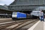 Die rote 185 596-4 von Crossrail zieht einen LKW-Zug durch Namedy Richtung Koblenz. Aufgenommen am 22/08/2015.