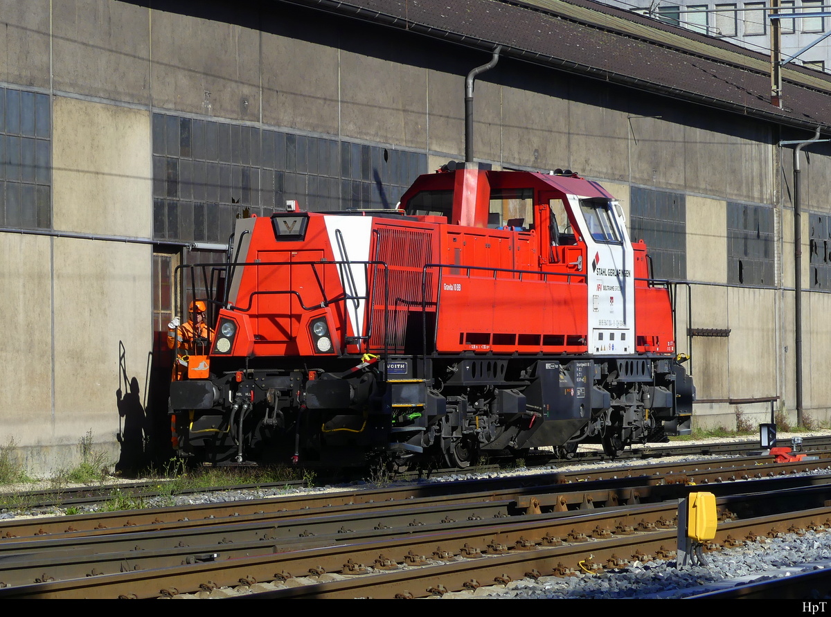 Em 9885 5837 830-9 holt die leeren Zementwagen im Übergabebahnhof. Hinter der Lok endet die Schmalspur des Dreischienengleises. Für die Meterspurfahrzeuge zum Holcimwerk und zum Kieswerk Untervaz wird dieses Ausziehgleis für die Spitzkehre benötigt. (24.03.2020) Herbert Graf