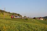 Am 18.06.2011 fährt R 25879 von Konstanz nach Weinfelden zwischen Kreuzlingen-Bernrain und Lengwil den Seerücken hinauf. In der Bildmitte im Hintergrund ist das sehr kleine, weiße, auf dem Kopf stehende „T“ die Wallfahrtskirche Birnau. Kurz nach dem Regionalzug sollte eigentlich eine Überführungsfahrt, bei der eine Re 4/4 eine dreiachsige Rangierlokomotive vom Typ Henschel DHG 700 C zieht vorbeikommen. Es dauerte aber etwas länger und die am oberen Bildrand sichtbare dunkle Wolke hatte am Fotostandpunkt das letzte Abendlicht so stark abgeschwächt, dass das Foto von der Überführungsfahrt zu dunkel wurde.