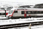 Ausfahrt eines IC mit dem Steuerwagen an der Spitze aus dem Bahnhof Zürich HB im Schneetreiben. Das Foto wurde vom Bahnsteig aus aufgenommen. Zürich HB, 2.12.2023