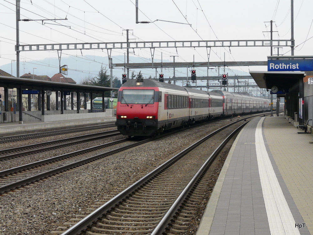 SBB - IR bei der durchfahrt im Bahnhof Rothrist mit dem Bt 50 85 28-94 975-5 an der Spitze am 12.03.2011