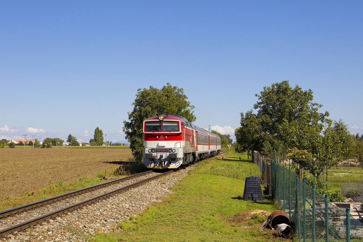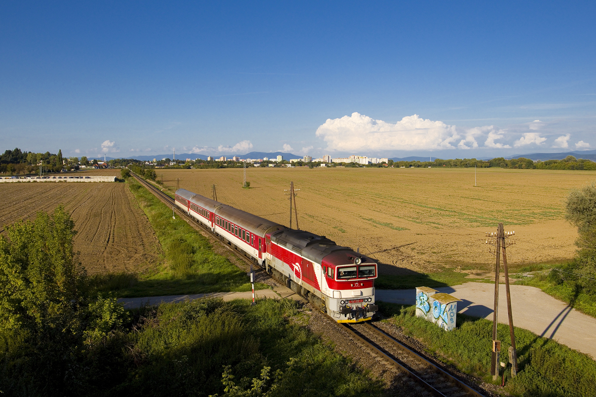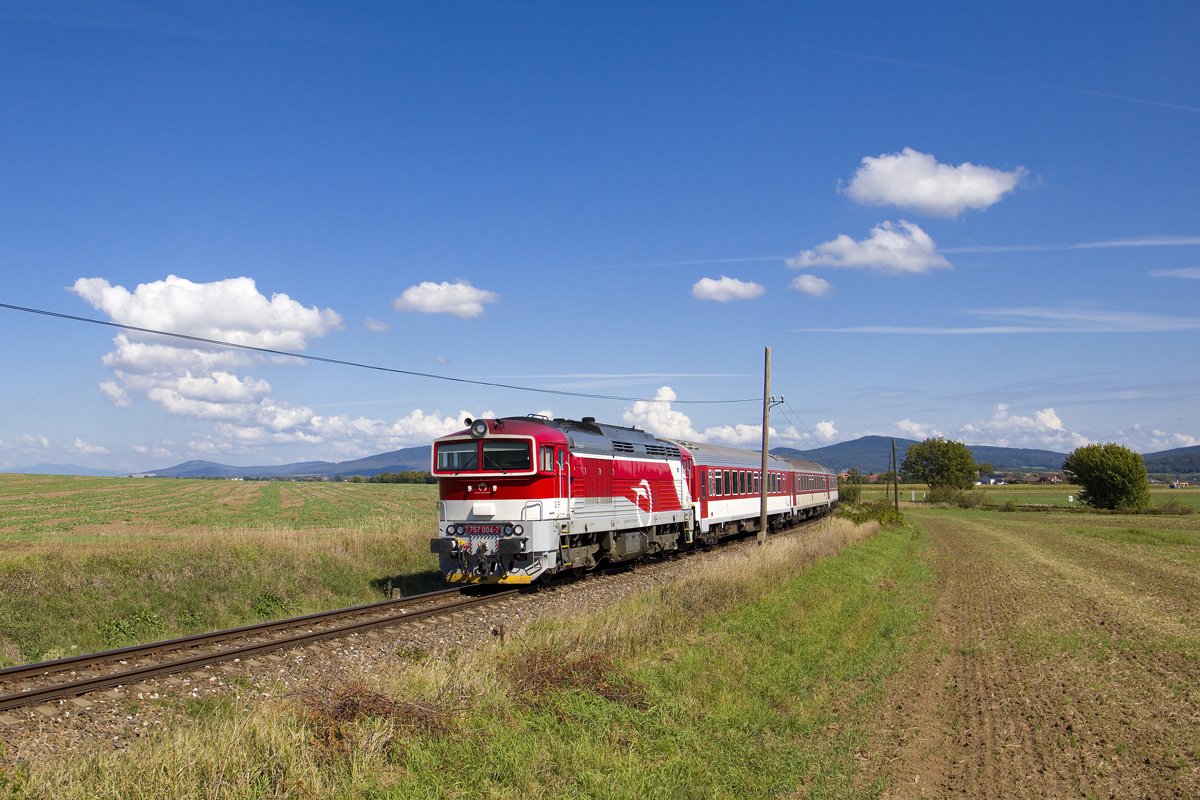Herbstliche Stimmung in der Slowakei, in Jazernica: Die 757 018 ist auf dem Weg mit dem Eilzug R341 nach Banska Bystrica (Neusohl).