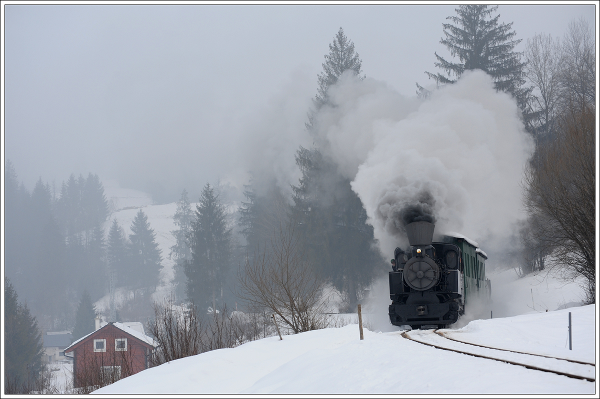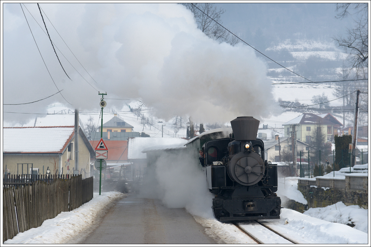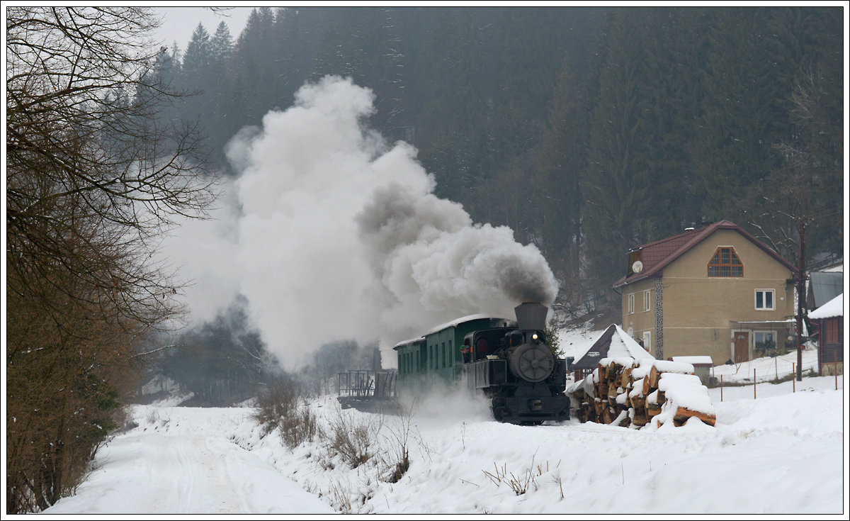 Lok Nr. 1 (Lok Nr. 5 lief kalt mit) kämpft sich am 27.1.18 kurz nach Čierny Balog die Steigung in Jánošovka Richtung Dobroč hinauf.