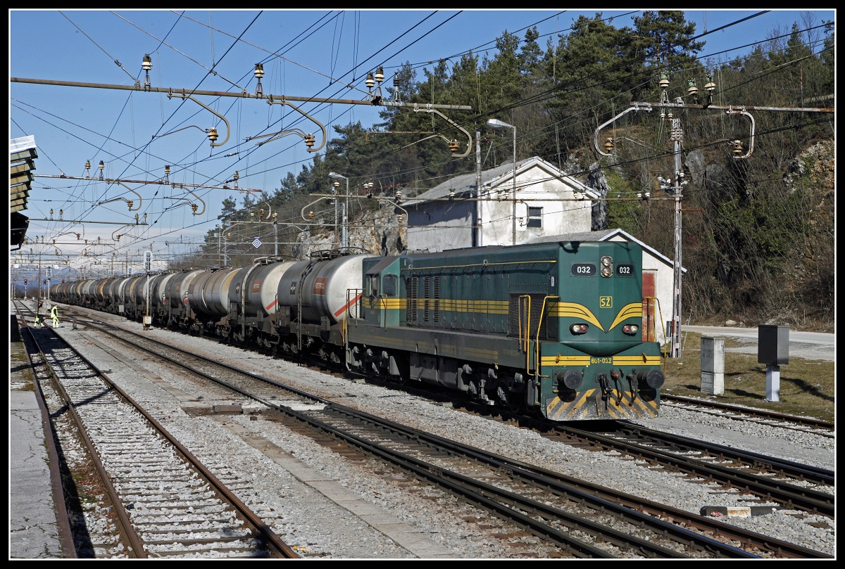 661-032 fährt am 13.02.2019 mit einem Güterzug durch den Bahnhof Rakek.