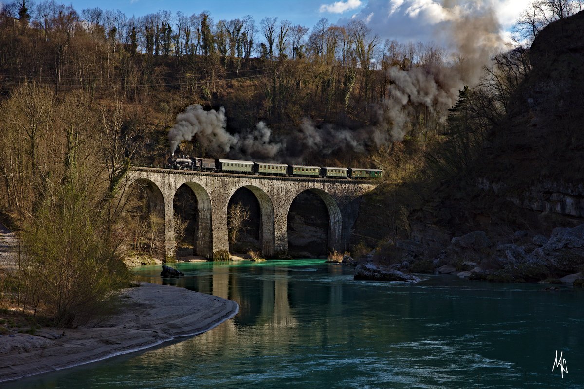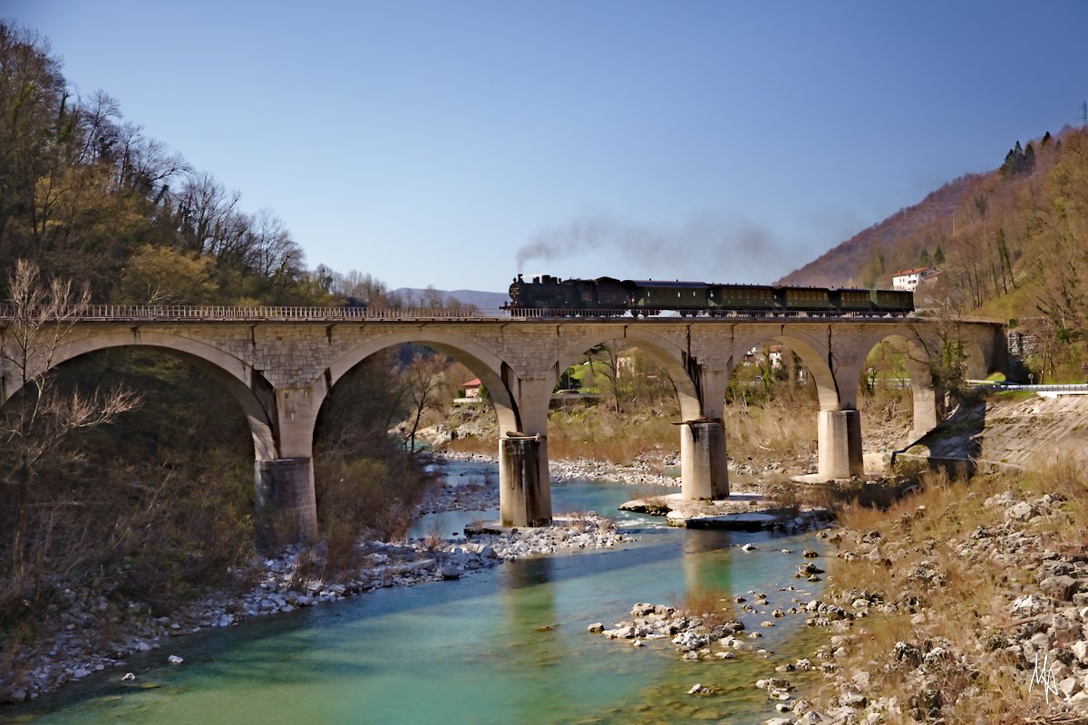 Kurz nach Most na Soci befindet sich diese imposante Brücke, die am 06.04.2018 von einem Fotosonderzug mit der 25.026 an Spitze befahren wird.