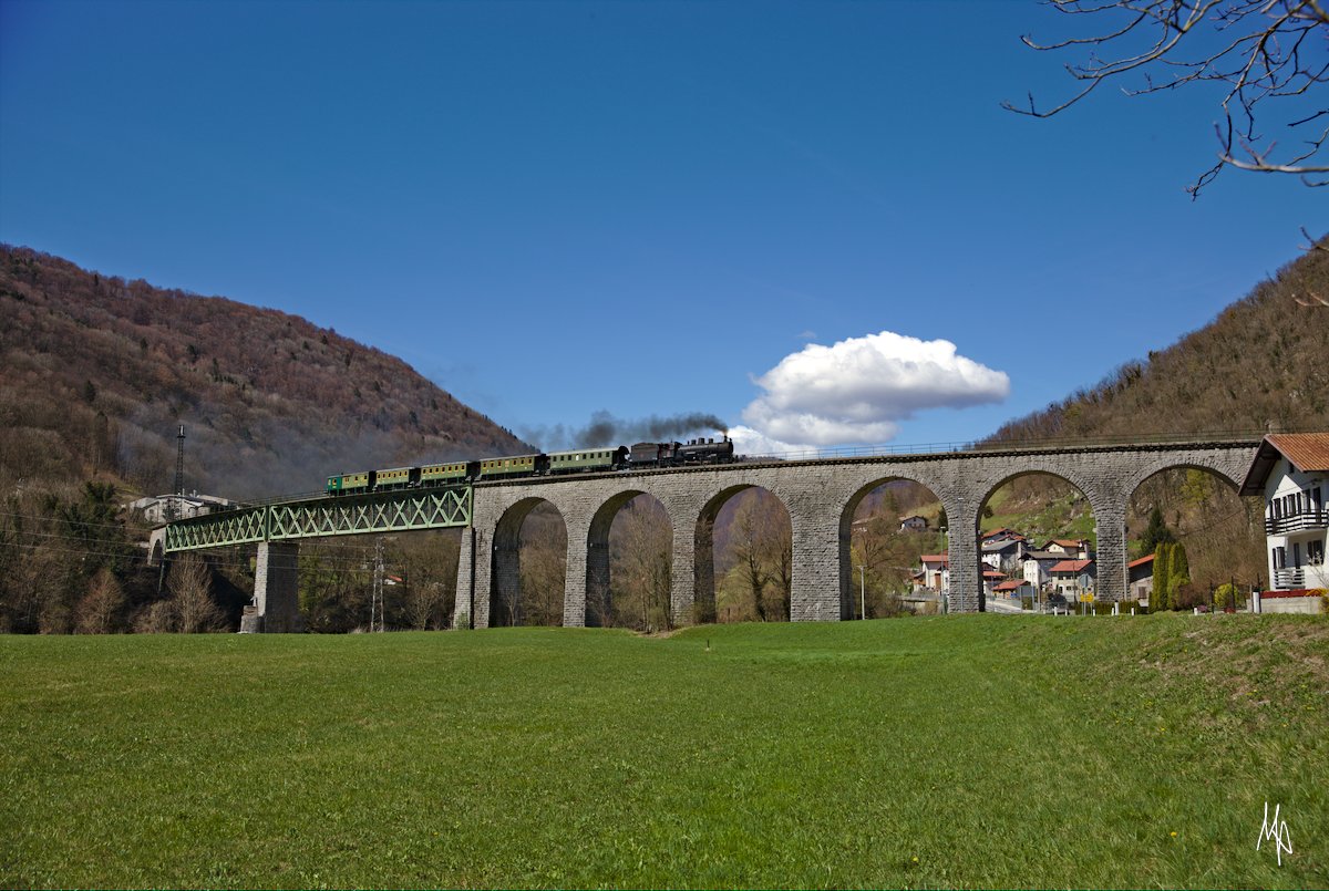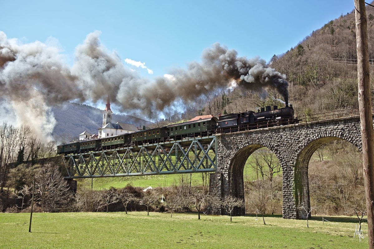 Eine Sonderzugfahrt ausschließlich für Fotografen brachte die 25.026 (ehem. kkStb Baureihe 170) auf die Strecke Nova Gorica - Jesenice, wobei der Fotozug nur den Abschnitt Anhovo - Grahovo befahren hat. Hier zu sehen ist der fotogene Zug kurz Avce. (06.04.2018)
