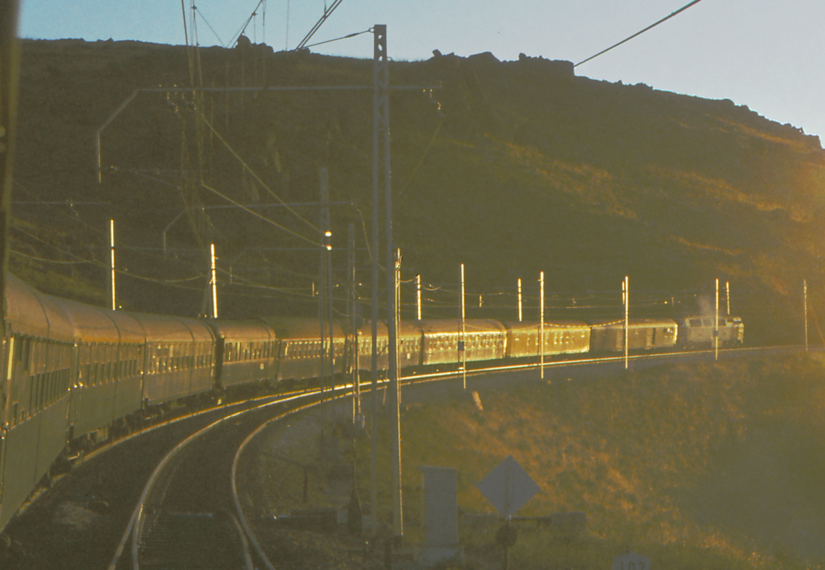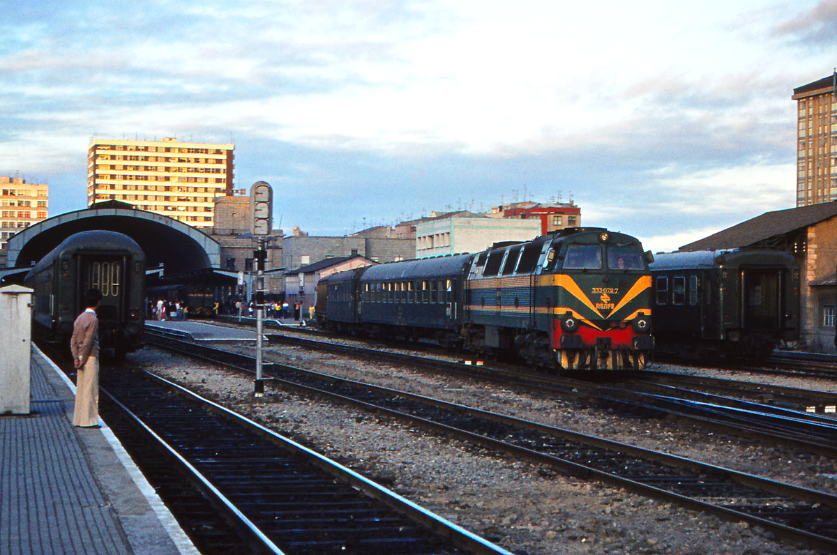 Nach einer nächtlichen Fahrt durch den Nordwesten Spaniens ist die Diesellok 333 057 mit dem "Rias Altas Expreso" aus La Coruna in Madrid Principe Pio eingetroffen. Oktober 1981.