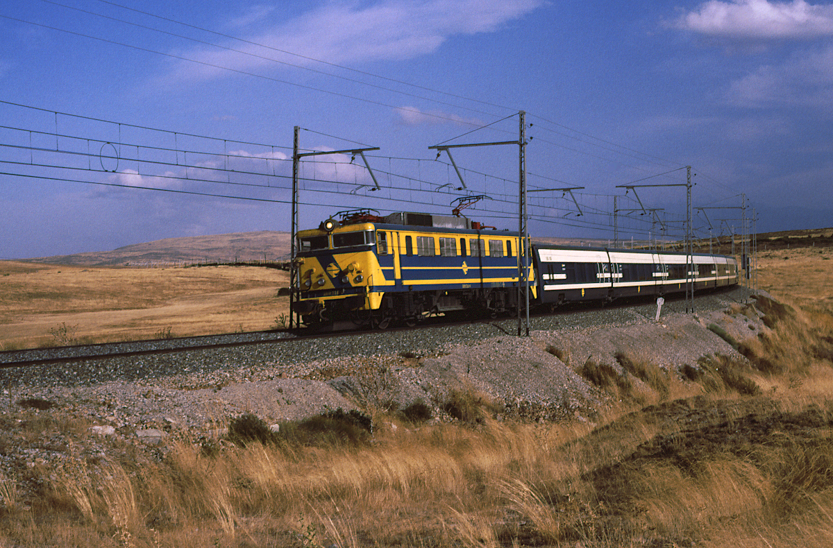 Im Hintergrund liegt San Lorenzo de El Escorial. Wieder ist das Führende Triebfahrzeug ein "Japonesa", ein 269 der ersten Bauserie. Oktober 1983