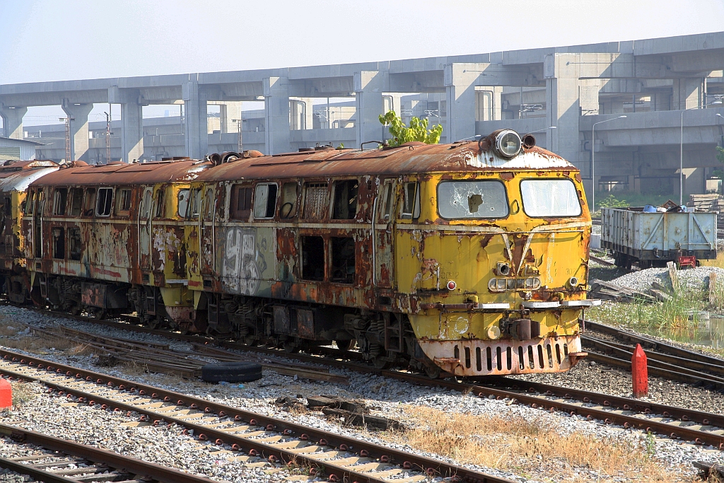 Im Gelände des Depot Bang Sue sind jede Menge ausgemusterte Fahrzeuge abgestellt, so wie die Henschel 3018 (dh, B'B', Henschel, Bauj. 1964, Fab.Nr. 30901) am 10.Dezember 2023.