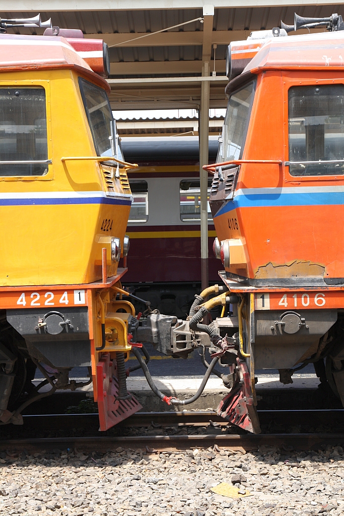ALS 4106 (Co'Co', de, Alsthom, Bj.1974) und AHK 4224 (Co'Co', de, Krupp, Bj.1980, Fab.Nr. K-5486) am 25.März 2017 im Bf. Hua Lamphong.