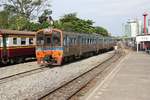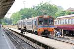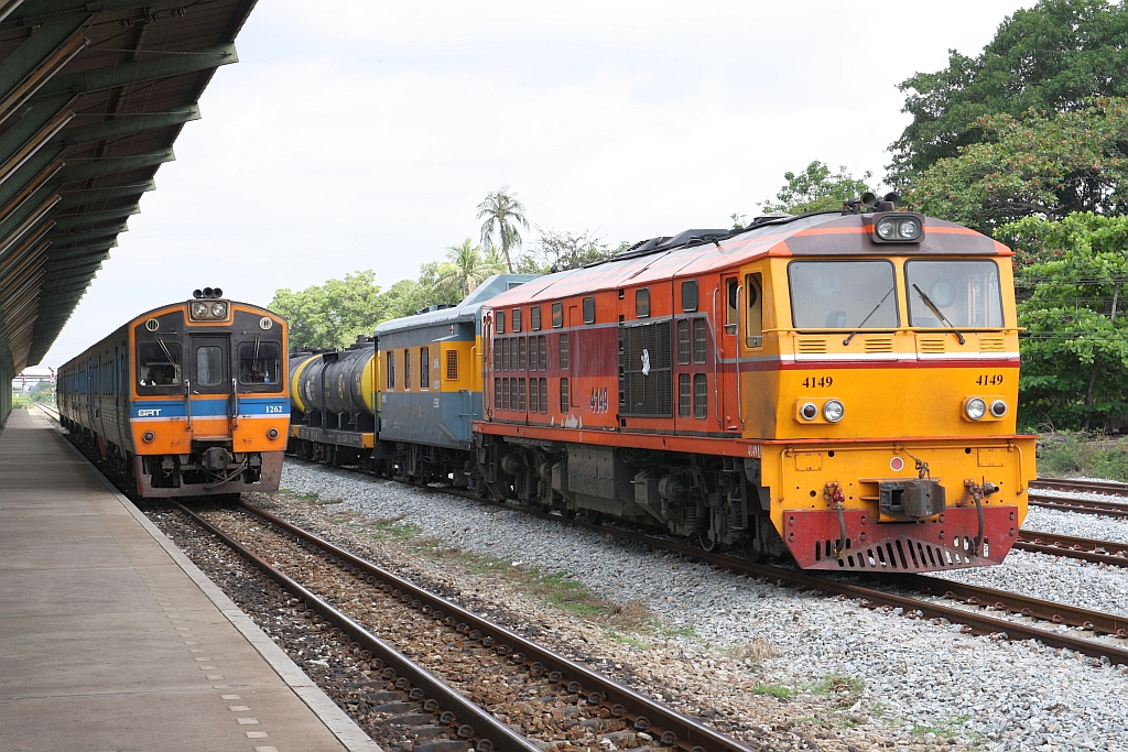 ALS 4149 (Co'Co', de, Alsthom, Bj.1974) wartet am 14.Mai 2017 in der Chachoengsao Junction Station auf die Vorfahrt des ORD 281 (Hua Lamphong - Kabin Buri) mit dem NKF 1262 (Tokyu, Fuji Heavy Industries and Nippon Sharyo, Bauj. 1985) als erstes Fahrzeug.