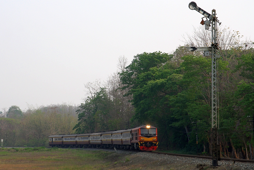 ALS 4108 (Co'Co', de, Alsthom, Bj.1974) am Morgen des 29.November 2025 vor dem LOC 485 (Kanchanaburi - Nam Tok) beim Strecken-Km 176,50 der Southern Line Nam Tok Branch.