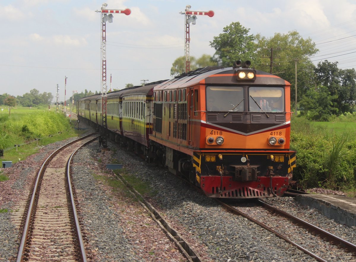 Im Bahnhof Ban Dan wartete mein Zug auf einem Schnellzug aus Bangkok ab, um eine freie Durchfahrt, auf dem Einspurabschnitt nach Uttaradit zu gelangen. ALS 4118 erreicht im Bild mit einem Schnellzug aus Bangkok (nach Den Chai)den Bahnhof Ban Dan. Montag, 31. Juli 2017