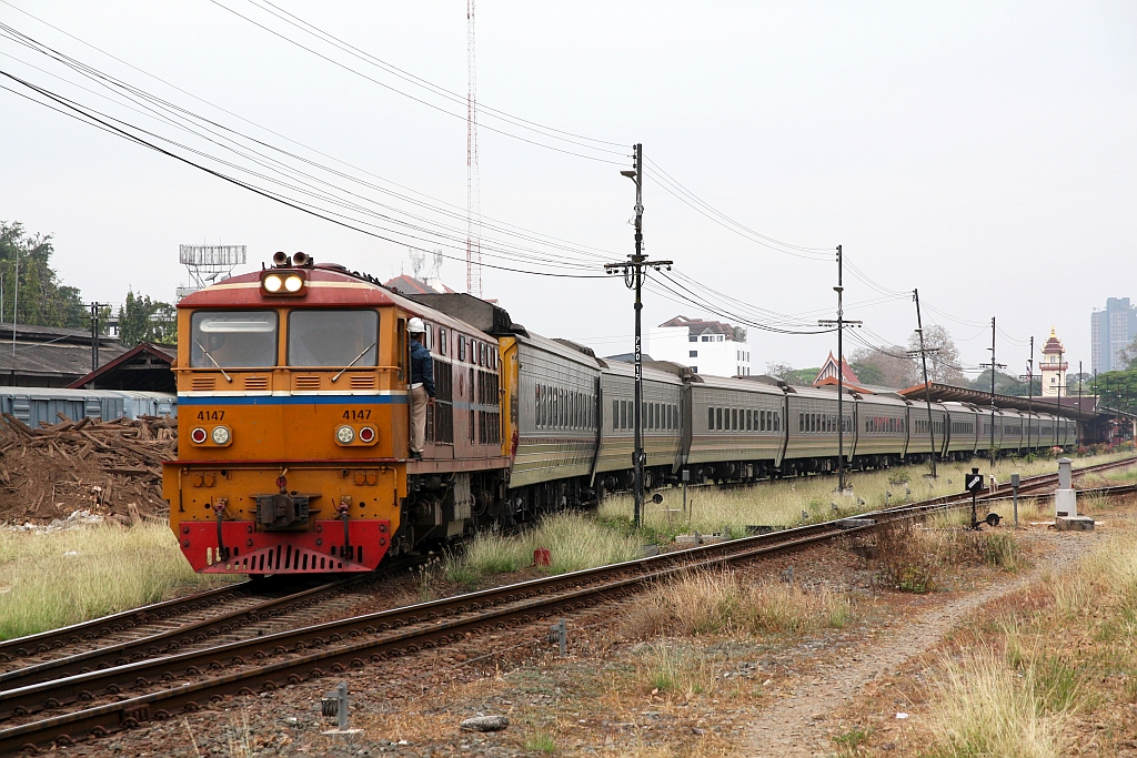 ALS 4147 (Co'Co', de, Alsthom, Bj.1974) am 23.Februar 2026 in der Chiang Mai Station als Verschubfahrt um den hinterstellten Wagensatz des Sp.Exp 9 für den Sp.Exp 10 nach Krung Thep Aphiwat zu holen.