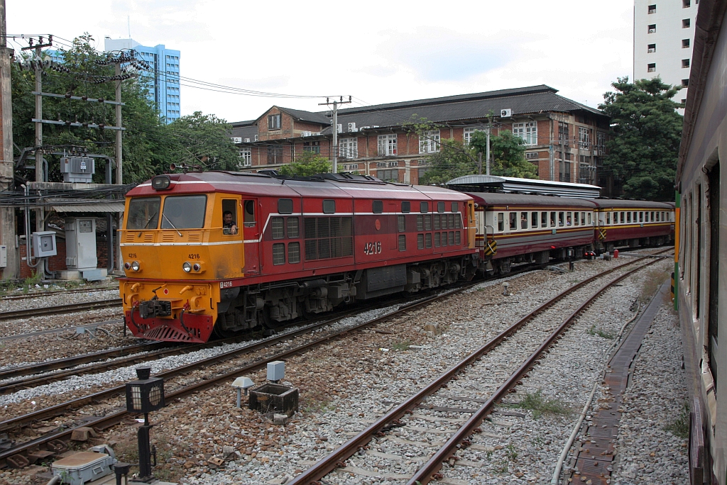 AHK 4216 (Co'Co', de, Krupp, Bj.1980, Fab.Nr. K-5482) fährt am 04.Dezember 2025 mit dem ORD 233 (Hua Lamphong - Surin) durch die Khlong Phutsa Station.