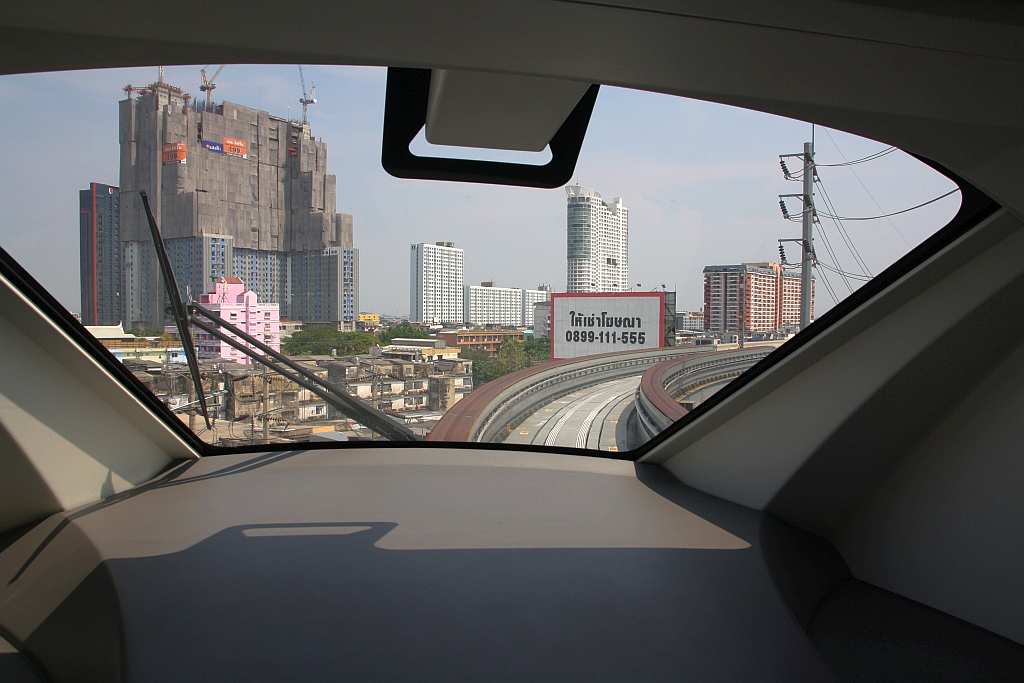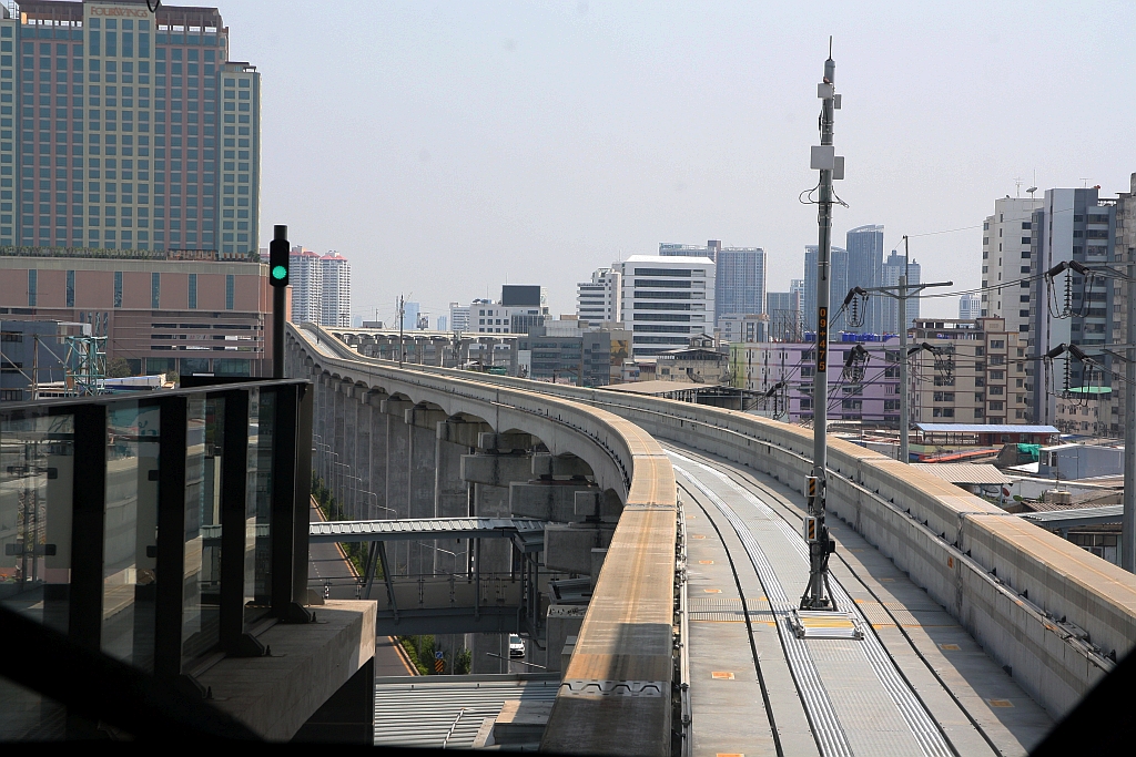 Blick aus dem MRT YM04 (Hersteller: Bombardier Transportation + CRRC Nanjing Puzhen, Type Innovia Monorail 300) auf den Streckenabschnitt der MRT Yellow Line (YL) zwischen der Bang Kapi Station (YL08) und der Yaek Lam Sali Station (YL09) am 25.März 2024. Karl Seltenhammer
