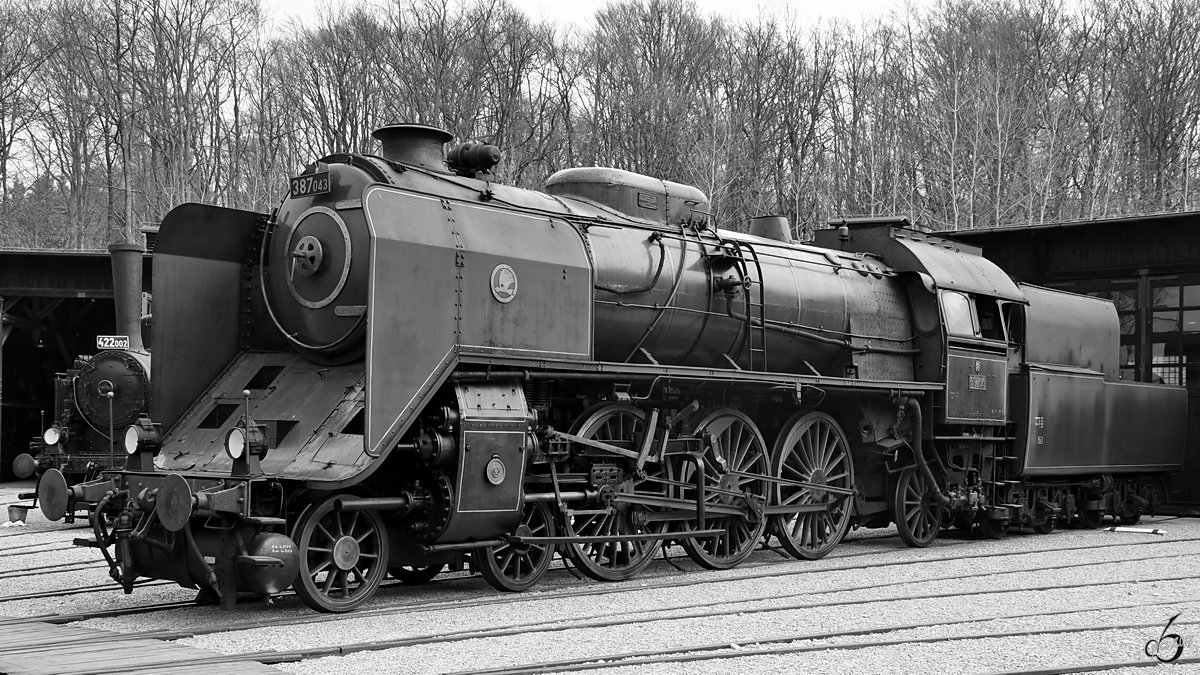 Die Dampflokomotive 387 043 Anfang April 2018 im Eisenbahnmuseum Lužná u Rakovníka.