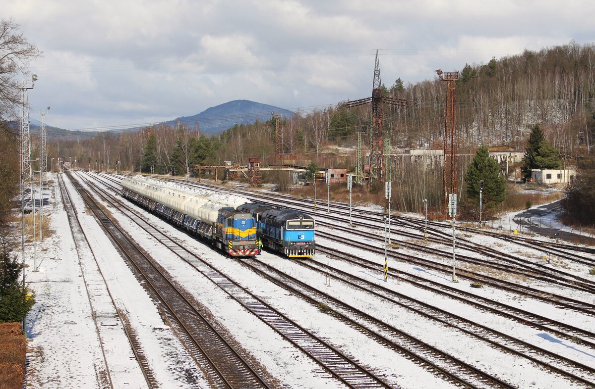 Die 740 419 und 740 860 waren in Zlutice mit einem kurzem Schotterzug am 21.06.2025 im Bahnhof abgestellt worden. Am späten Nachmittag konnte der Zug bei bestem Sonnenlicht noch fotografisch festgehalten werden.
