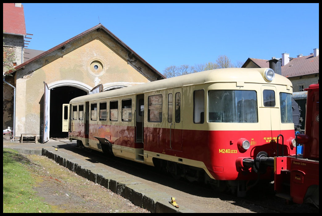 Am 1.5.2024 schaute ich vormittags bei dem kleinen Eisenbahnbahnmuseum in Krimov nahe der Grenze zu Sachsen vorbei. Das Museum ist quasi das alte Eisenbahn Depot mit zweiständigem Lokschuppen gegenüber dem nicht mehr besetzten Bahnhofsgebäude.Es liegt an der Strecke Chomutov - Veiperty. Dort arbeiten einige Eisenbahnenthusiasten aus Tschechien alte CSD Fahrzeuge wieder auf. Unter anderem gehört auch der äußerlich schon perfekt aufgearbeitete Motorwagen 240.033, der an diesem Tag aus dem Lokschuppen gezogen worden war. Gerd Hahn
