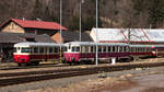 Dieseltriebwagen der CSD: Zwischen 1959 und 1964 stellte die CSD für den Regionalverkehr 122 Triebwagen der Reihe M 240.0 (später 820) in Dienst. Während die Triebwagen bis 2001 ausgemustert wurden, wurden die letzten Beiwagen erst 2019 abgestellt. Im Frühjahr 1998 steht eine dreiteilige 820-Garnitur abfahrbereit im Bahnhof Karlovy Vary. Horst Lüdicke