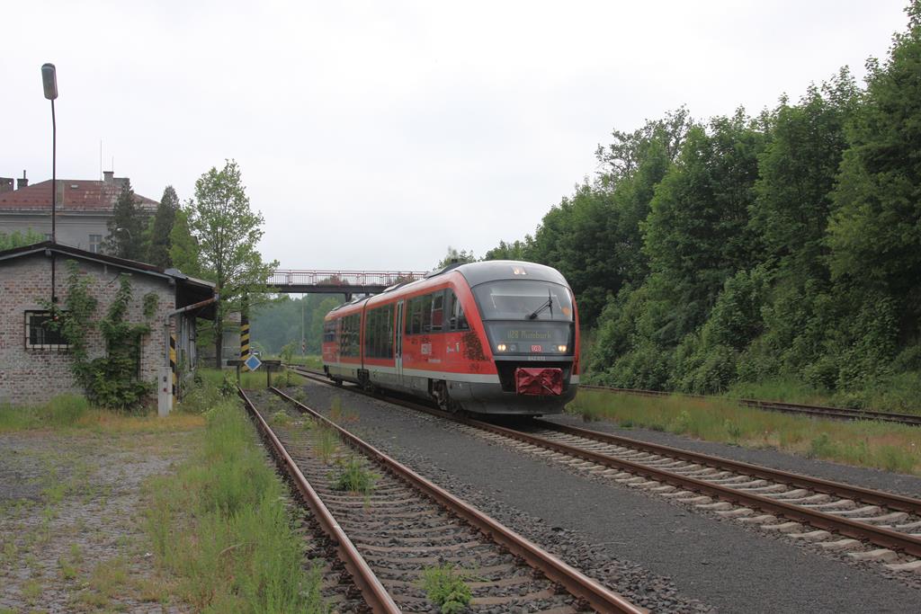 Bei trüber Witterung war am 24.5.2016 der DB Desiro 642032 in Tschechien unterwegs. Hier verläßt er um 17.46 Uhr den Bahnhof Dolni Poustevna in Richtung Endbahnhof Rumburk.