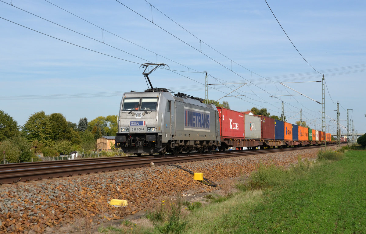 386 008 der Metrans führte wegen der Sperrung bei Elsterwerda ihren Containerzug am 23.09.19 durch Gräfenhainichen Richtung Bitterfeld.
