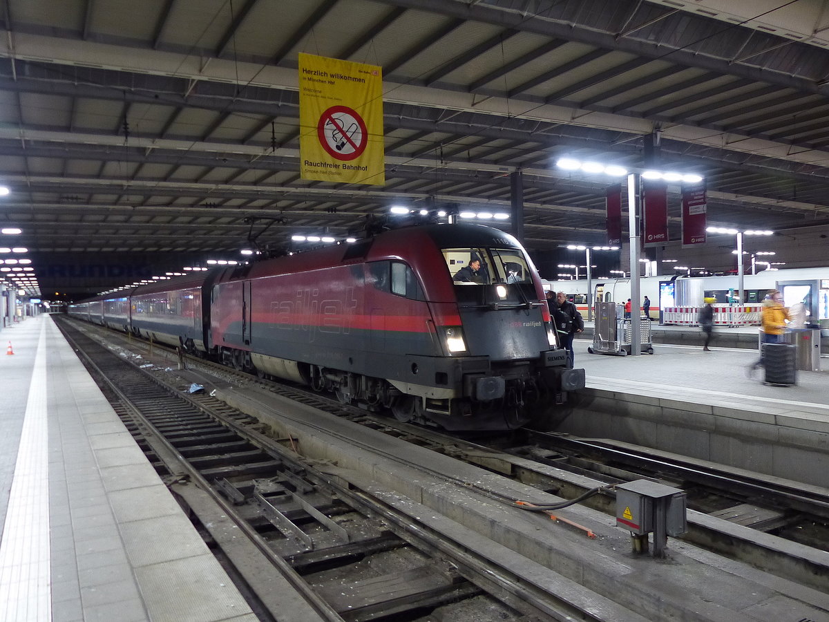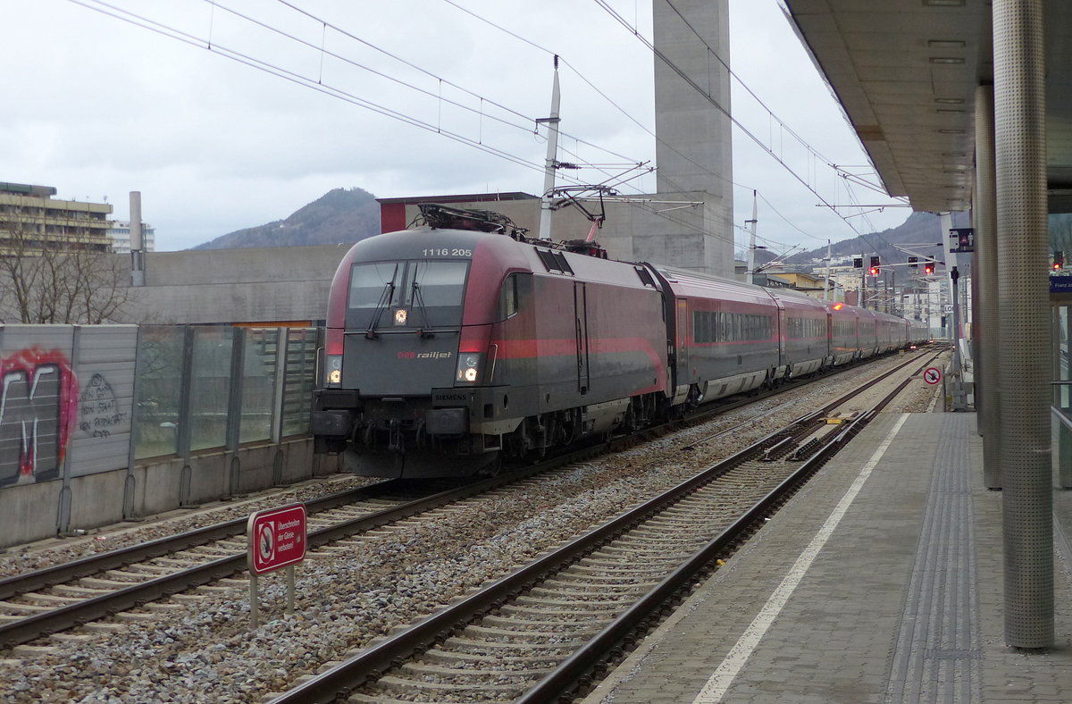 Vom Belvedere über Usti nad Labem hat man einen schönen Blick auf den Bahnhof Usti nad Labem h.l.n. mit dem dort abgestellten zweiteiligen RJ 654 006, Oktober 2025.