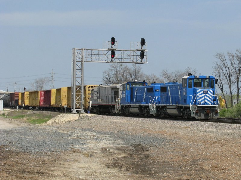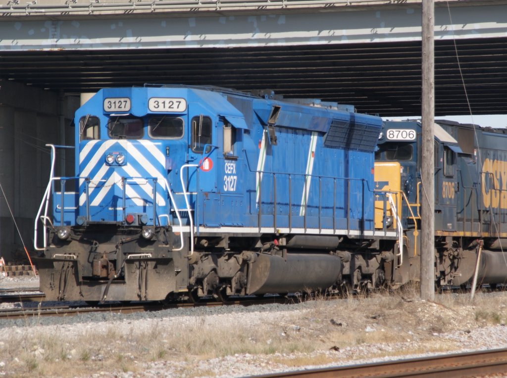 Links sind zwei CEFX Loks zusehen, dahinter sind noch zwei Union Pacifc Loks abgestellt, während rechts zwei BNSF Loks auf weitere Aufgaben warten. Aufgenommen am 3.11.2007 in Houston.