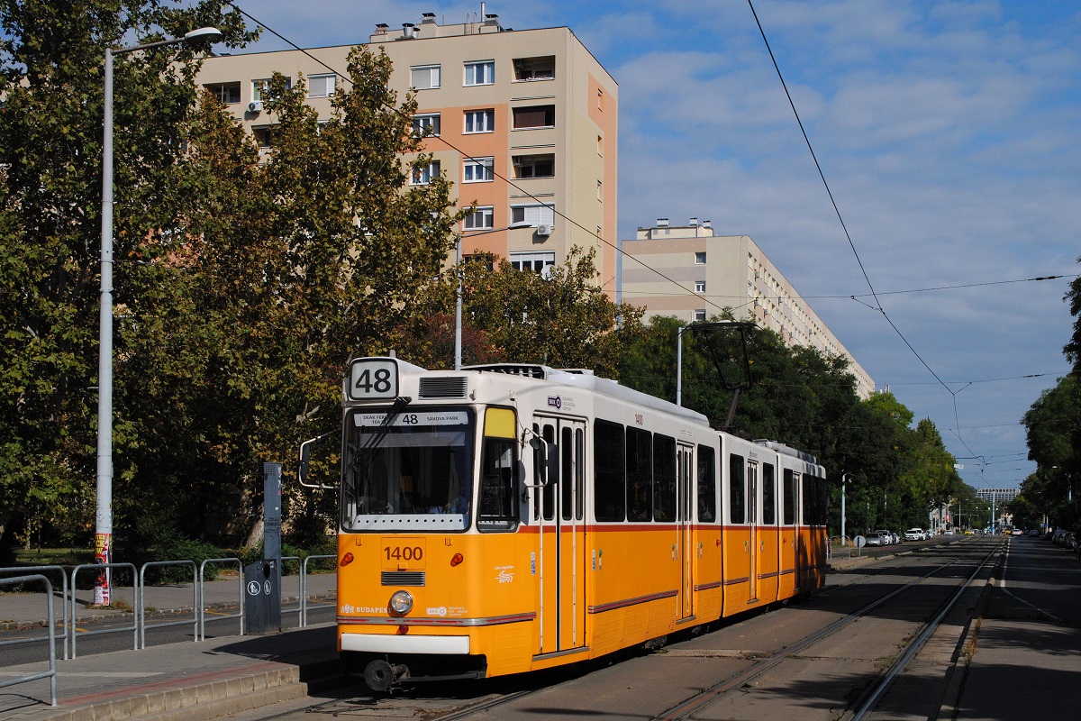 Tw.1400 im Einsatz auf der Wochenendlinie 48, die zwischen dem Deak Ferenc ter und dem Einkaufszentrum Savoya Park betrieben wird, bei einem kurzen Stopp in der Haltestelle Kalotaszeg utca. (27.09.2025)