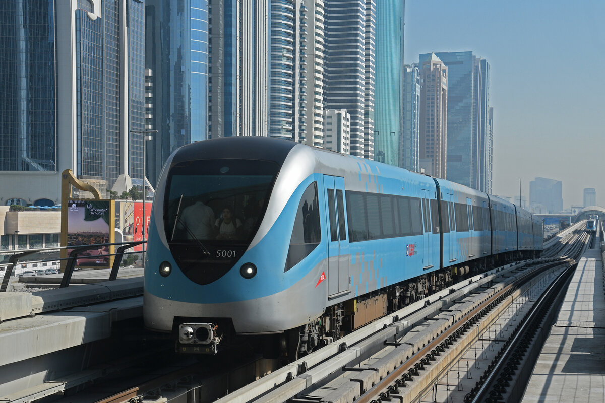 RTA Metro 5046 in Dubai fährt am 02.04.2025 zur Station Emirates Towers.
