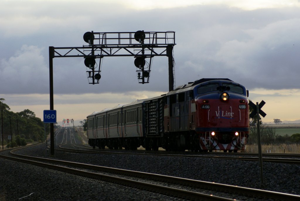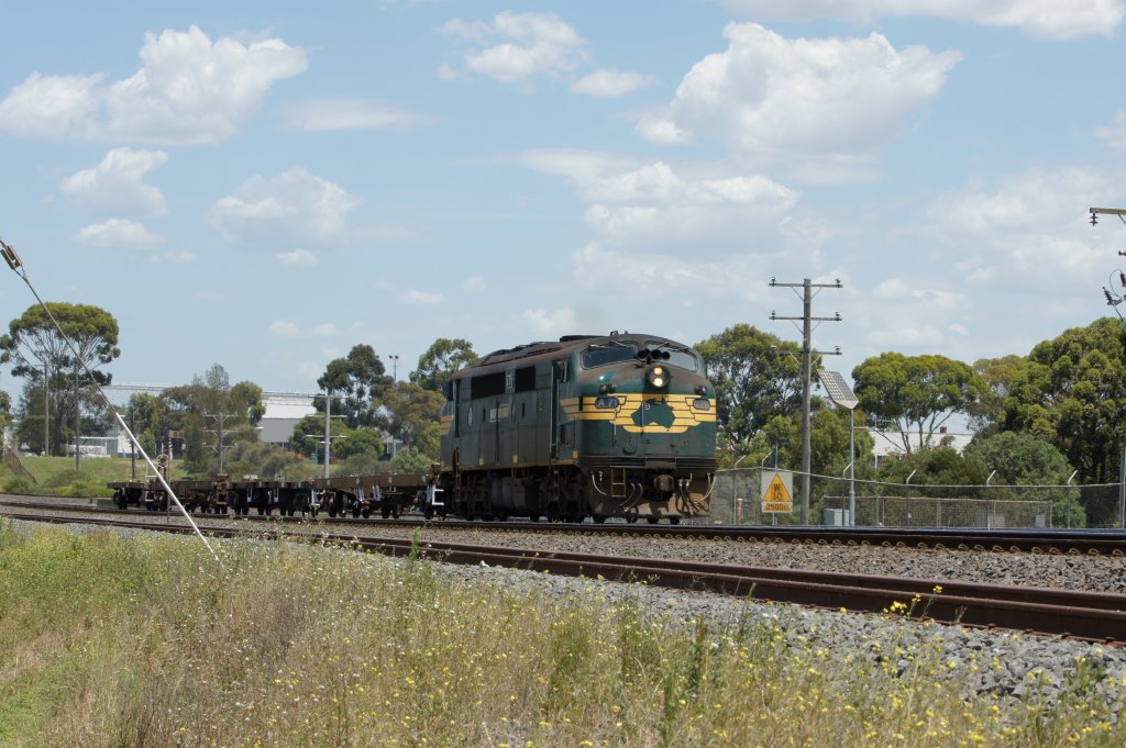 Morgendliche Güterzug gezogen von einer A78 und mit dabei 3 vielfachgesteuerte Loks des Typs P an einem Stücker richtung Seymour und weiter. Loks gehören der Firma Pacific National. Tallarook am 19.2.2008