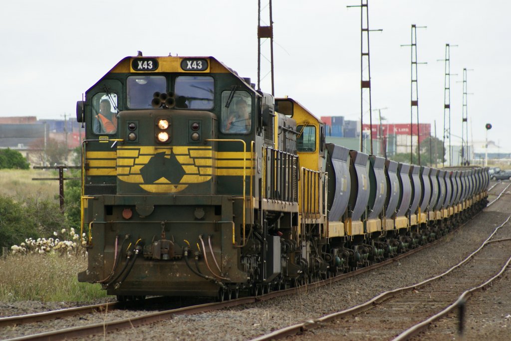 Sunshine Cargo Freight Terminal für Getreideverlad. Links vom Hafen her kommend ein Kohlezug in Richtung Gellong - Adelaide. Gezogen von einer X und einer H Class